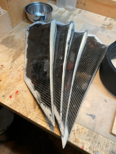 Ich bin etwas voran gekommen mit der A4 und so möchte ich Euch den aktuellen Zustand nicht vorenthalten. Finnen und Körperrohr kommen zusammen stand auf dem Plan. Und zwar so, wie vom Erbauer der Form und von Roman erfolgreich verifiziert, an das Körperrohr angeklebt..... Nun ist "Finnen einfach ankleben" ja eher etwas aus dem Low-Power Bereich, und harmoniert keinesfalls mit der geplanten Motorisierung im J-Bereich, aber ich vertraue da mal ganz Romans Erfahrung und betrete da (für mich) mal komplettes Neuland. Romans Empfehlung bezieht sich dabei auf die Wahl eines geeigneten Klebers. In meiner Welt hätte ich die Finnen mit angedickter Epoxi/Glasballonmatsche angeklebt, und aus meiner Erfahrung heraus sind die Nähte und Fillets so starr, das sie bei der erstbesten seitlichen Belastung dann einfach abbrechen oder aufbrechen. Die "erstbeste seitliche Belastung" bei einer Rakete mit dermaßen nach hinten überstehenden Finnen wäre dann auch gleich die erste Landung Heck-voran am Fallschirm hängend. Wie das immer so ist, fällt das Geraffel ja nicht in die Wiese, sondern trifft den steinharten Fahrweg neben der Wiese. Meine 4" TinTin Rakete und die 3" Jayhawk (obwohl bei weitem nicht so groß) können da ein Lied von singen. Alle vier Finnen wurden sauber entgratet, der Schaum passend runtergeschliffen und die Klebeflächen amtlich angeraut, sofern nicht durch das Abreissgewebe schon rau genug. Die Empfehlung lautete, ein langsamer oder mittelschneller, zähelastisch aushärtender Kleber auf Epoxyd-Basis. Im Raum standen da zB 3M ScotchWeld DP490 oder Araldite 20irgendwas von Huntsman. Das 3M Zeug kostet in der 50ml Doppelkartusche um 40€, gehts noch? Das Araldite-Zeug war mit 23€ wesentlich günstiger und so wurden zwei Kartuschen angeschafft, inkl. Dosierpistole und einem Dutzend Mischdüsen zum Einmalgebrauch. Für den Klebevorgang kam das präparierte Bodenbrett und der 3D gedruckte Ausrichtefuchs zum Einsatz. Ich bin restlos begeistert. Zum Einen natürlich vom Ergebnis, zum Anderen von dem Klebezeug. Sauber zu applizieren, langsam genug um sauber und überlegt zu handeln, schnell genug, um 30 Minuten später mit der nächsten Finne weiterzumachen. Überhaupt kein Vergleich zu 5 Minuten Epoxi. Außerdem absolut bombenfest, aber spürbar flexibel. Ohne mir weitere Gedanken zu machen würde ich da (wie geplant) guten Gewissens einen mittleren J-Motor reinstecken. So begeistert übrigens, das die Wracks der TinTin und der Jayhawk auch gleich noch ein paar Klebenähte verpasst bekommen haben. Das verspricht eine endlose Lackiererei zu werden, wenn hier alles fertig ist, was ich auf dem Tisch habe. Aber ich schweife ab, zurück zur A4. Ab jetzt ist zweifelsohne zu erkennen, was es werden soll. Das kann sich doch sehen lassen!? |