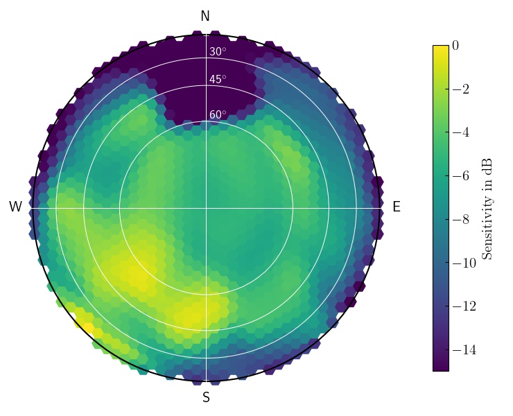 Ich habe sogar die U-Center Software mit Wine ans Laufen gebracht, klappte weitgehend unproblematisch. U-Center gibt einem richtig gute und detaillierte Informationen aus. Darunter auch die Position der verschiedenen Satelliten am Himmel und der Verlauf der Signalstärke. Das sieht dann z.B. so aus: Meine Idee war, dass wenn man über viele Stunden Satelliten über den Himmel ziehen lässt (wie es auch in dem Bild oben angedeutet ist) und dabei permanent die Signalstärken aufzeichnet, man einen recht guten Eindruck vom Antennendiagramm und den Empfangseigenschaften erhalten sollte. Ich hatte eigentlich schon geplant, eine solche Analyse zu programmieren, habe dann aber gesehen, dass U-Center das für einen schon macht. Nach über acht Stunden Datensammeln sah das dann so aus: Die Farbskala gibt an, in welche Richtung der Empfang wie gut ist. Offensichtlich nach oben hin ganz gut, ebenfalls nach Süden. Bei niedrigen Eelevationen, also zum Horizont hin ist der Empfang erwartungsgemäß schlecht und nach Norden geht gar nichts. Das sind so schon mal gute Ergebnisse. Vielleicht schreibe ich aber trotzdem nochmal ein Skript um so eine Analyse nochmal etwas schicker durchzuführen und dann vielleicht auch mit einer besseren Positionierung der Antenne, entweder im Dachfenster oder auf dem Balkon. Gruß Schmidti |