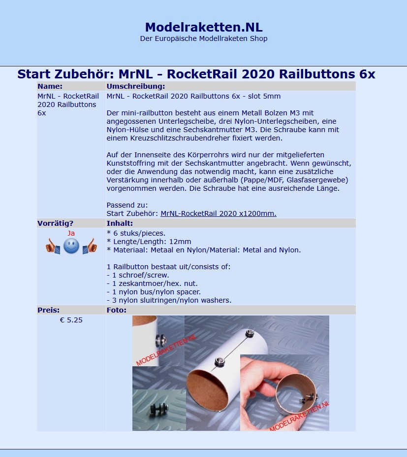 danke für deine Antwort und die damit verbundene Einschätzung. Zitat: Was ich noch anmerken bzw. fragen wollte: Startrampe / Rail Bisher habe ich alle Modelle >50mm Kaliber mit Klima's Railbuttons zum Kleben ausgerüstet. Sinnig, da ich ja auch seine Rail benutze, allerdings an einem Scheinwerferstativ, nicht auf der kleinen Rampe. Für die Kaliber 50mm und 75mm hat das immer gut gespielt. Ist diese Rail eigentlich für den Einsatz von H-Motoren noch geeignet? Oder bräuchte ich hier eine größere bzw. längere Rail? Für den Flamingo (und spätere, größere Modelle wie Peregrine) würde ich dann diese Railbuttons bestellen, die sollten zur Rail passen. LG Jens Geändert von Jens Schultz am 26. Februar 2026 um 20:55 |